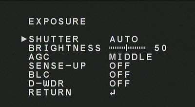 Первый пункт этого меню изменить невозможно, т. к. объектив на этой камере неуправляемый. Второй пункт, «Exposure», является самым интересным и содержит вложенное меню: