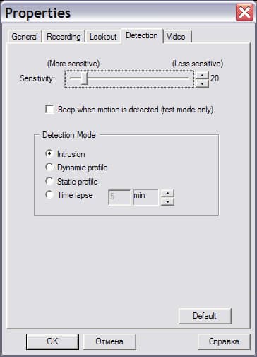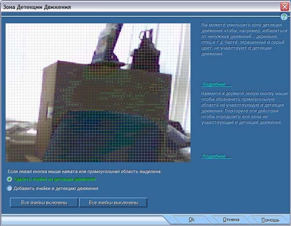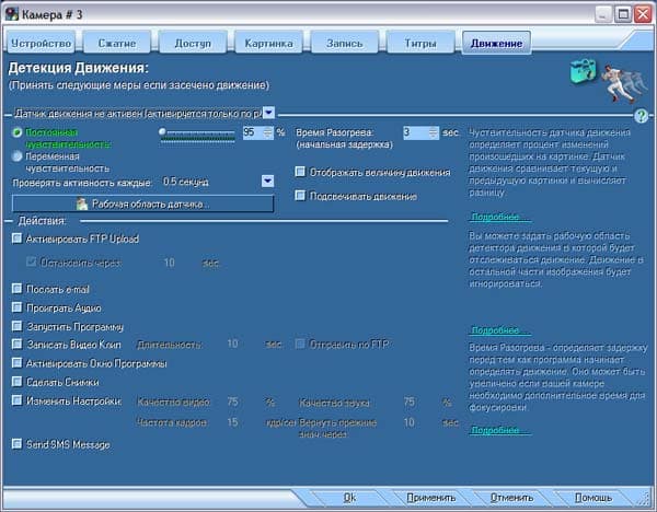 - настройка чувствительности и зон детектора движения. Настройка зон детектора движения производится в основном окне с использованием клавиш, расположенных в правой части окна программы; настройка чувствительности детектора движения производится здесь: