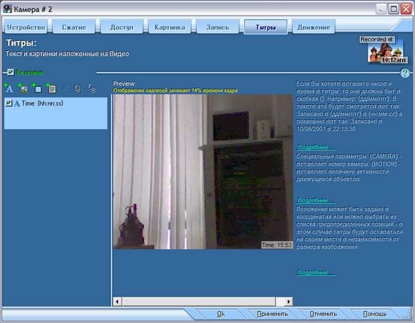 - Возможность в произвольном месте кадра вывести (и сохранить на жесткий диск) любую пользовательскую информацию. Этой информацией могут быть текущие дата/время, название камеры и т.д.