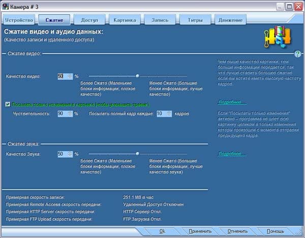 Например, на подключенном для экспериментальных целей жестком диске объемом 120 Гб, при условии записи кадра размером 640х480 с частотой 8 к/с вместе со звуком, может разместиться не более 24 часов видеоархива. При этом для записи используется формат фирмы-разработчика с максимально возможным качеством.