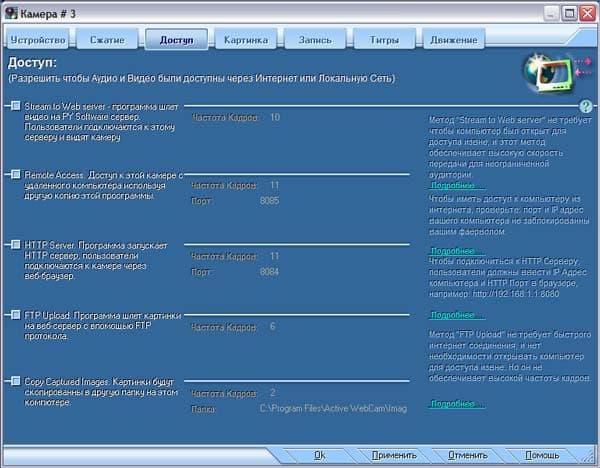 - Работа с тремя типами видеоустройств: локальная видеокамера, удаленная IP-видеокамера и видеокамера, подключенная к другому ПК с установленным ПО Active Webcam;