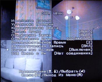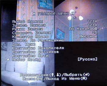 Это главное меню устройства. Здесь можно выставить такие параметры, как выбор количества подключенных видеокамер, режим записи (квадратор или каждый канал отдельно), скорость записи (к/с), качество записи. Отсюда же есть доступ к следующим меню: