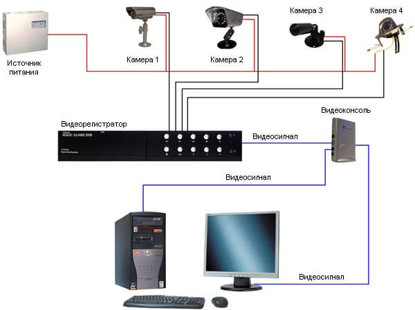 Достаточно несложная схема получается. Видно, что блок питания запитывает сразу все четыре видеокамеры, что видеоконсоль позволяет скоммутировать два источника видеосигнала, что на видеорегистратор подключаются также все четыре видеокамеры.