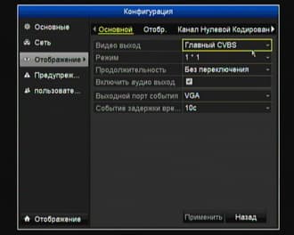 | Выбор основного и дополнительного видеовыходов. Видеовыходы в регистраторе не дублируют друг друга, они независимы. Так, на мониторе, подключенном к регистратору по D-sub, может отображаться текущая картинка с камер. В это же время на телевизоре, подключенном к регистратору по композиту, можно вести поиск событий, изменять системные настройки, или дублировать картинку с камер. | Настройка действий при тревоге (звуковое оповещение, вывод на экран, сообщение по электронной почте). В качестве триггера могут выступать такие события, как переполненность или отказ жесткого диска, отключение сети и прочие сетевые проблемы, попытка входа неавторизованным пользователем и другие |