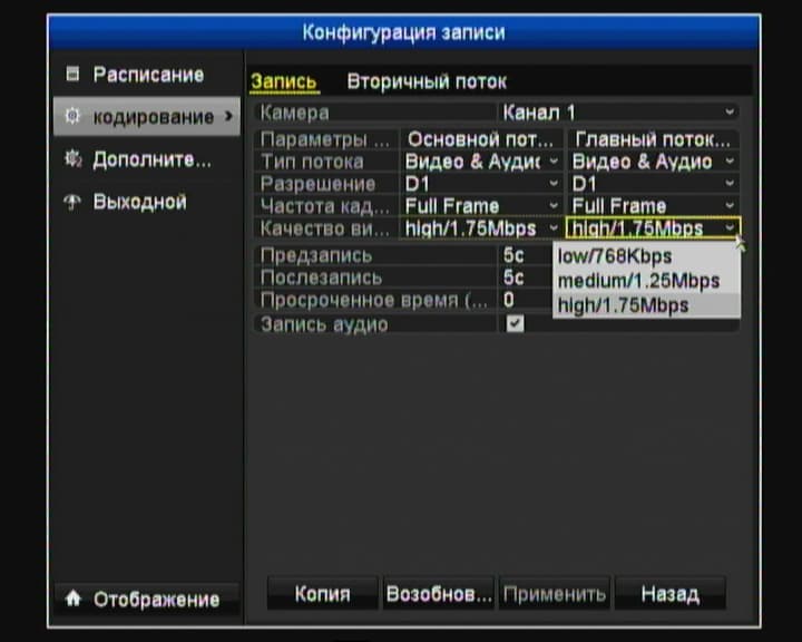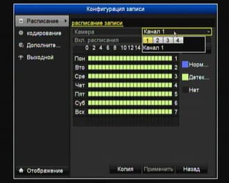 | Определение интервала работы для каждой камеры в отдельности | Настройка параметров записи для каждой камеры: тип потока, частота кадров, три варианта битрейта, время записи, предшествующей событию, а также послезаписи |