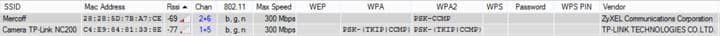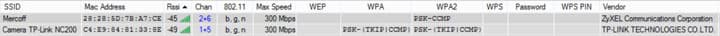 Создаваемая камерой точка доступа поддерживает любой способ шифрования и имеет настройку ограничения количества одновременно подключенных клиентов от 1 до 10. Камера может быть подключена к роутеру по Wi-Fi или проводным соединением, это неважно: точка доступа камеры будет работать в обоих случаях. Назвать ее особо мощной, конечно, не получится — но и глупо сравнивать маршрутизатор с миниатюрным гаджетом, в котором создание беспроводной точки доступа является всего лишь побочной функцией. Однако в сравнении с обычным домашним роутером (Zyxel Keenetic Omni) точка доступа, созданная камерой, выглядит вполне недурно. На следующем скриншоте можно видеть силу сигнала обоих устройств: −45 дБ и −49 дБ соответственно (ноутбук, на котором запущена программа, анализирующая беспроводные сети, находился недалеко и на равном расстоянии от маршрутизатора и камеры).