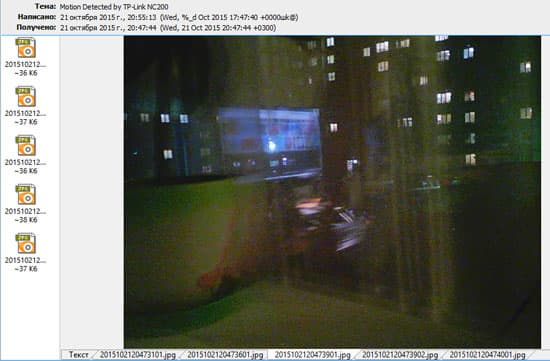 Практика показала, что камера в случае срабатывания детектора движения отсылает на FTP или E-Mail целую серию стоп-кадров, сжатых в JPG, числом до пяти в зависимости от длительности запечатленного события. Каждый стоп-кадр имеет название, обозначающее текущую дату и время создания снимка.
