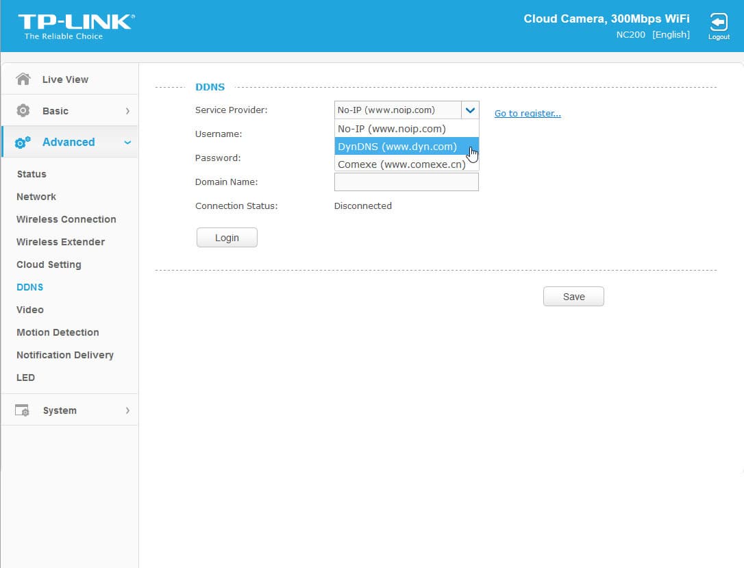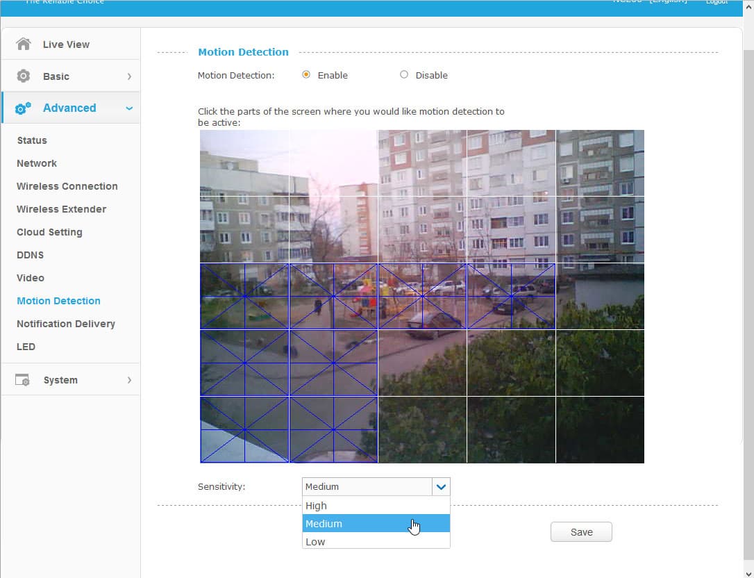 Для того чтобы пользователь имел возможность подключиться к веб-интерфейсу камеры не только из локальной сети, а отовсюду, камера имеет поддержку трех сервисов, предоставляющих постоянное доменное имя компьютерам с динамическим IP адресом: No-IP, DynDNS и Comexe. Параметры изображения, находящиеся во вкладке Video, позволяют изменить частоту кадров транслируемого видеопотока (от 5 до 20), качество изображения (высокое, среднее, низкое), включить/отключить компенсацию засветки, а также активировать наложение поверх видео текущей даты и времени и/или пользовательского текста (например, имени или номера камеры в системе). Детектор движения настраивается посредством активации любого количества имеющихся прямоугольных зон, на которые поделен видеокадр. Также имеется трехступенчатая настройка чувствительности к движению.