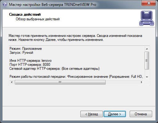 | Далее определяем параметры потоковой передачи видео (разрешение, битрейт): | Смотрим итоговую сводку с выбранными параметрами веб-сервера: |