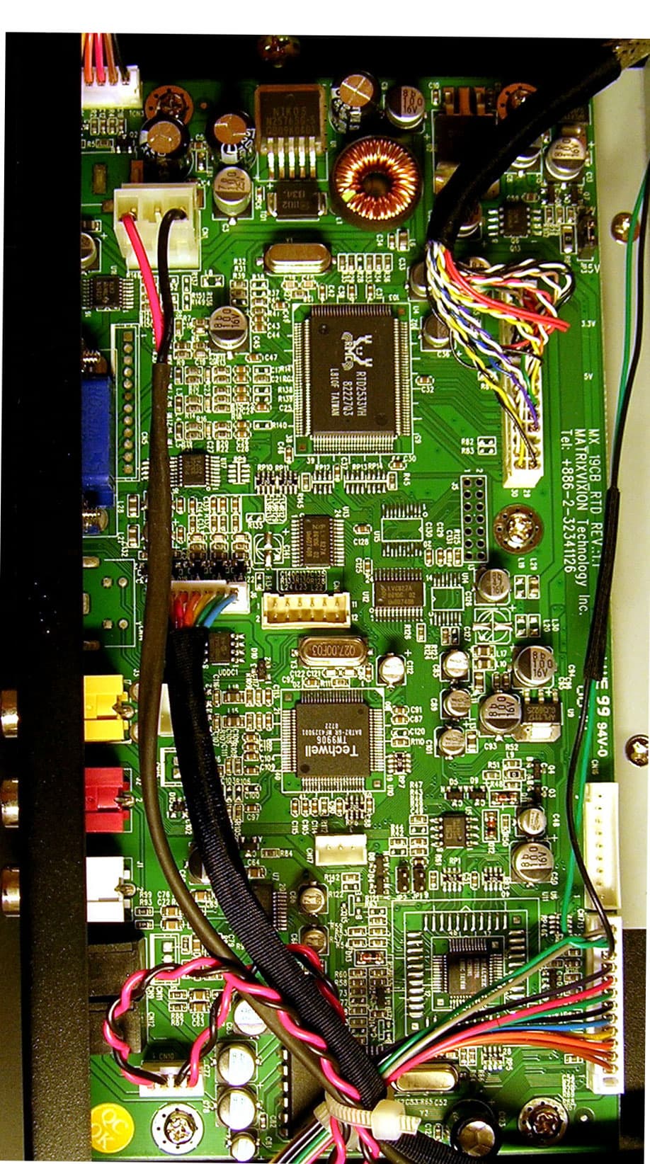 Отлично видны разъемы для подключения внешних аудио и видеоисточников. Часть кабелей экранирована металлическими шинами, на правом краю платы можно разглядеть наименование этого блока и производителя. Основой платы служат два чипа — это Realtek RTD2533 (являющийся контроллером изображения), и высококачественный мультисистемный видеодекодер TW9906 (обеспечивает коммутацию нескольких видеовходов).