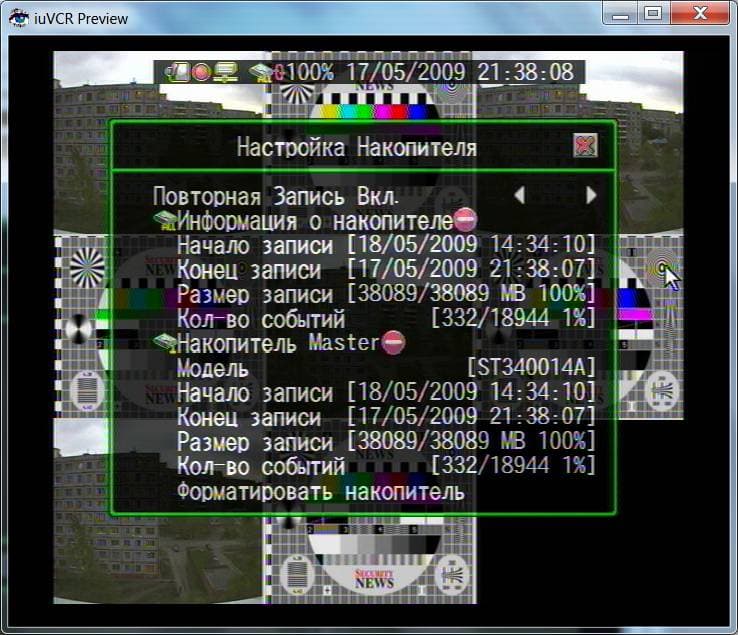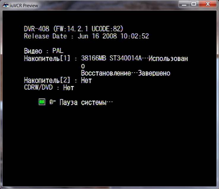 При первом включении видеорегистратор предложит отформатировать жесткий диск. В результате этой операции будет создан раздел в проприентарной файловой системе (нам не удалось выяснить, что это за система; при подключении к компьютеру Acronis Disk Director v.9 сообщил о полностью свободном пространстве на жестком диске). В дальнейшем, при включении, мы будем наблюдать такой экран: