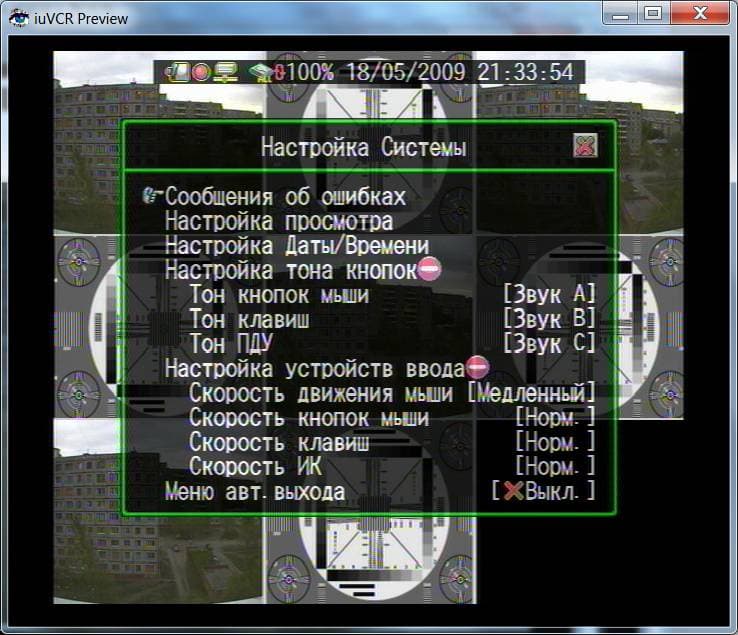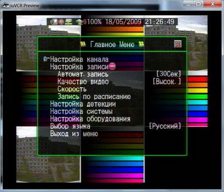 Надо сказать, что уровень доступа к видеорегистратору определяются именно паролем. Сам пароль можно набрать либо мышкой (указывая на определенные цифры), либо с ИК-пульта (нажимая на соответствующую клавишу). Конечно же, никто не запретит вам набрать пароль и с передней панели устройства. Благополучно пройдя аутентификацию, мы попадаем в главное меню видеорегистратора: