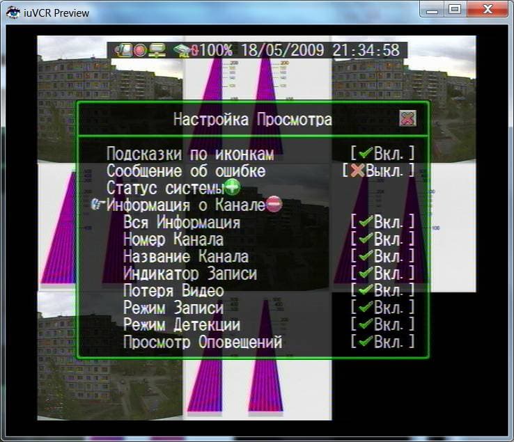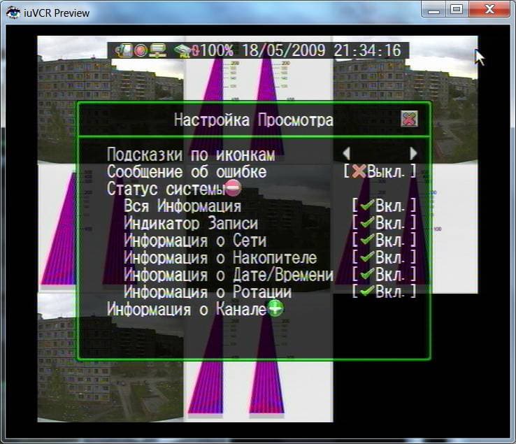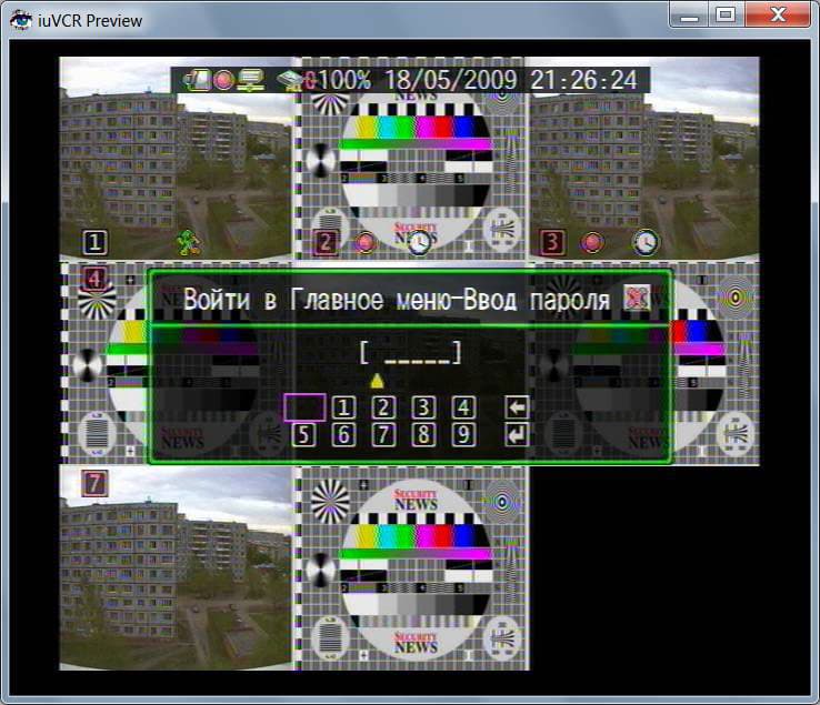 В верхней части экрана узкой полосой отображен текущий статус устройства, на каждом канале небольшими значками указаны номера и режимы записи. Возможно несколько вариантов отображения одна, четыре или восемь камер на экран. Кроме того, имеется режим последовательного просмотра камер. При попытке входа в меню выйдет запрос пароля: