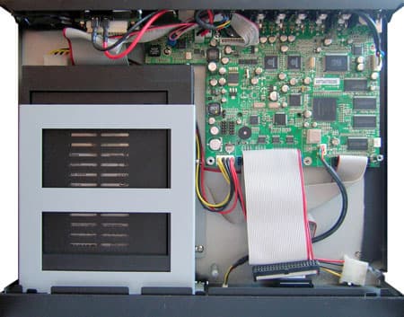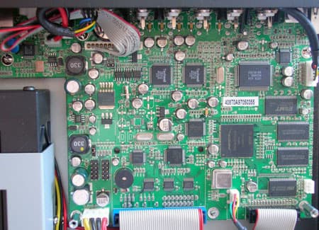 Из снимка видно, что, в отличие от ранее описанного видеорегистратора, эта плата занимает немного меньше места. Шлейф, соединяющий накопители и плату UDMA33, что говорит о довольно невысокой интенсивности обмена информацией между накопителями и платой.