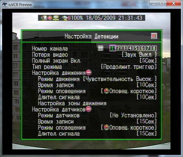 Как мы ранее и подозревали русскоязычная версия интерфейса видеорегистратора в наличии. Практически все меню переведено на русский язык, причем самая большая погрешность этого перевода это слово "Объем" вместо "Пробел" в одном из диалогов (хотя, если честно, английское слово "space" можно перевести и таким образом). На наш взгляд, все переведено настолько удачно, что никаких двойственных толкований терминов здесь нет. Само меню состоит из нескольких разделов, группирующих в себе ряд настроек соответствующей тематики. Что интересно такие разделы, как "Качество видео", "Скорость", "Запись по расписанию", входящие в раздел "Настройка записи", сразу же видны и доступны, как наиболее востребованные, что ускоряет и упрощает настройку. Заглянем в первый пункт "Настройка каналов":