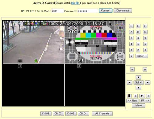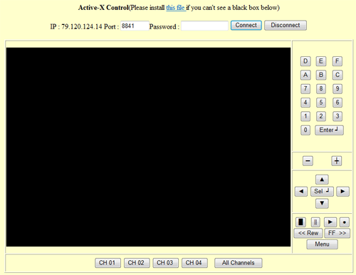 В самом верху ссылка на клиентское ПО, нажать нужно обязательно (а перед этим обязательно залить клиентское ПО на сам видеорегистратор; о том, как это делается, мы писали немного выше по тексту). Скачали, сохранили, запустили, согласились и подтвердили, и в итоге это ПО у нас установлено. Теперь, набрав в адресной строке браузера IE http://адрес_видеорегистратора (и если вы сменили порт доступа то указав и его), вводим пароль доступа. После недрогнувшей рукой жмем "Connect" и мы в эфире подключены: