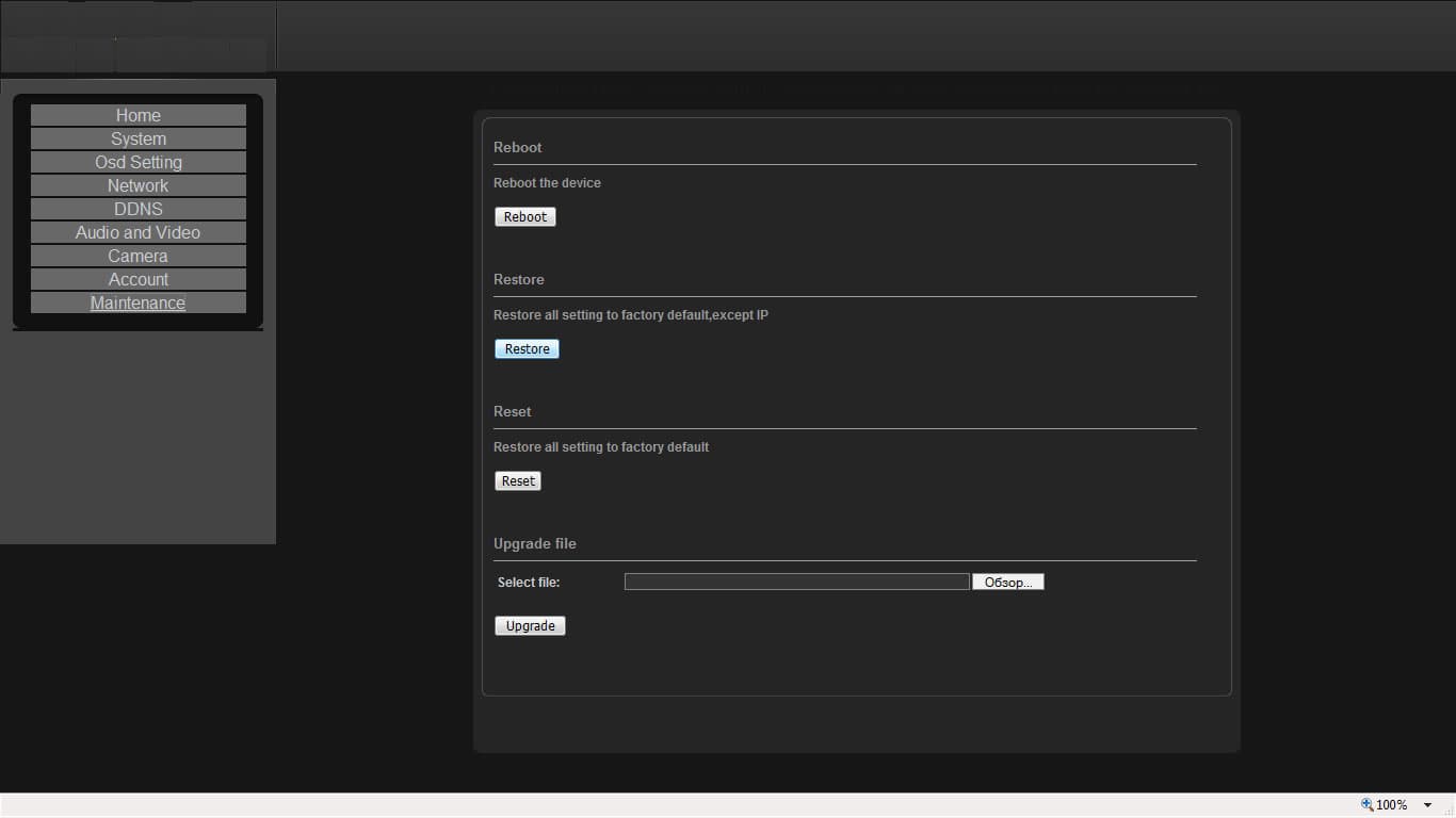 Наконец, страница обновления встроенного ПО и возврата к «умолчальным» заводским установкам.