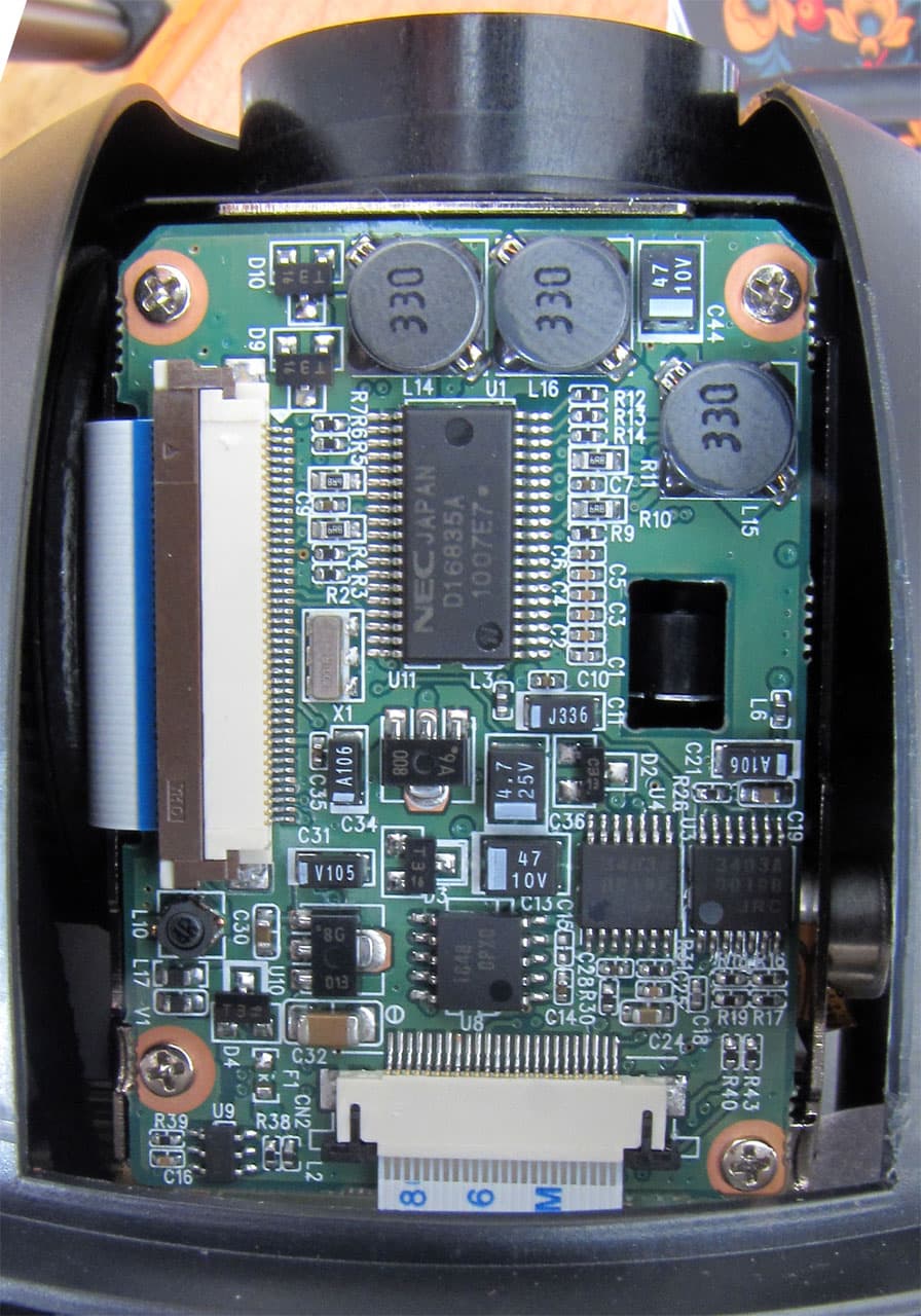 Этими переключателями определяется протокол, адрес и скорость передачи данных при управлении камерой с помощью интерфейса RS485. Сама плата камеры выглядит вполне традиционно, в центре её располагается один из главных электронных компонентов — чип D16835A производства NEC.