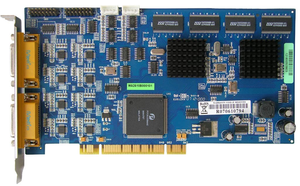 На снимке хорошо видно, что два довольно больших чипа прикрыты массивными радиаторами. Именно на эти чипы возложены основные функции этой платы, а именно: аппаратная оцифровка видео- и аудиосигналов, а также детекция движения. Насколько удалось выяснить у разработчиков этой платы, эти микросхемы являются не чем иным, как DSP (Digital Signal Processor, Цифровой Сигнальный Процессор) семейства TMS320C6XXX, производством которых занимается знаменитая Texas Instruments. Основные характеристики этого семейства вы сможете найти на www.ti.com/dsp. В нашем случае именно этот чип и обеспечивает захват и сжатие видео совместно со звуком по четырем каналам (не забываем, что на плате два подобных чипа в итоге 8 каналов) в реальном времени. При этом максимальное разрешение при захвате любых двух (не совсем "любых", конечно, но один канал на один DSP) каналов видео может достигать 640 на 480 точек, в то время как остальные каналы будут захватывать видео с разрешением не более 320 на 240 точек. При этом на экран выводится настоящее "живое" видео! Подобная схема захвата обусловлена конструктивными особенностями этого DSP.
