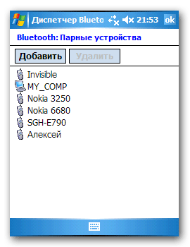 а со стороны КПК делаем следующее: перво-наперво нужно "спарить" два устройства компьютер и КПК, в результате чего в этом списке появится имя вашего компьютера: