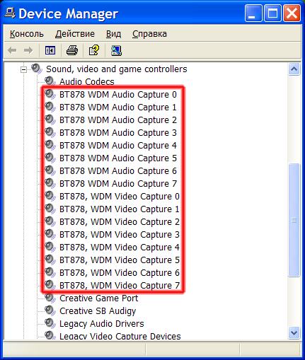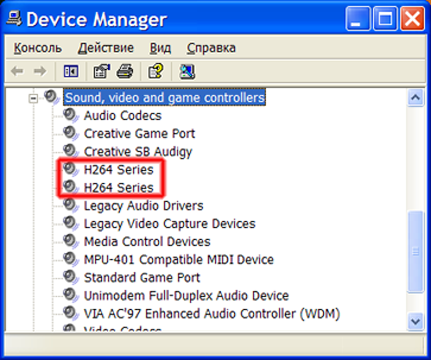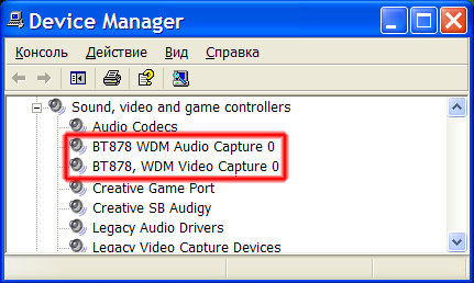 Для подключения видеокамер на плате имеются 4 BNC-разъема. Микрофон также подключается к этой же плате. После установки идущих в комплекте драйверов в диспетчере устройств наблюдается следующее: