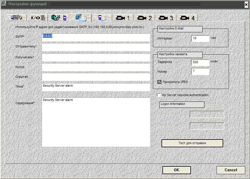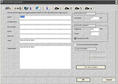 Следующая вкладка позволяет настроить отправку уведомлений о тревоге с помощью электронной почты: