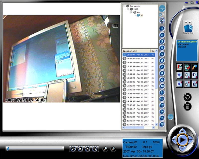 На панели справа размещен ряд инструментов, с помощью которых можно произвести подстройку яркости, контрастности, сделать моментальный снимок с видеозаписи, а также произвести конвертацию архивной видеозаписи в стандартный avi-контейнер.