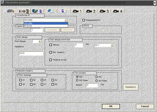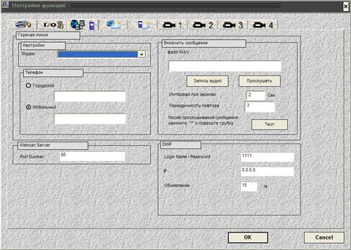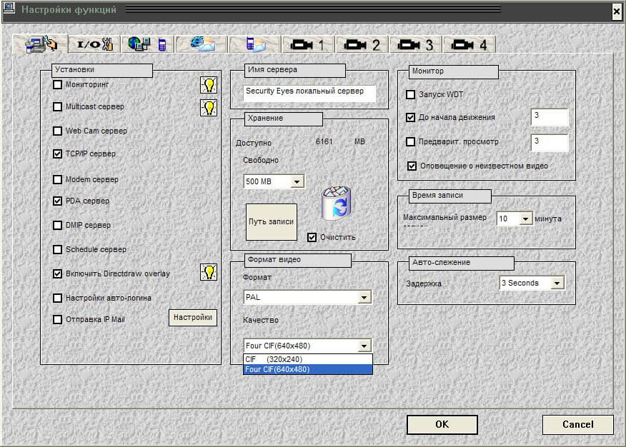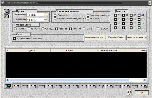 Здесь мы можем задать режимы записи системы в зависимости от определенных пользователем настроек. Т.е. возможна запись по расписанию, по детектору движения, по внешнему датчику (при наличии платы PV154). Несмотря на небольшие проблемы с отображением русских шрифтов, все вполне понятно.