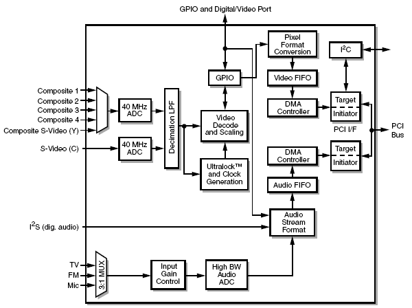 Как видно из фотоснимка, основой этой платы видеозахвата является чип Conexant 878A, который и обеспечивает оцифровку четырех видеоканалов с аналоговым видеосигналом. Для интересующихся техническими характеристиками этого чипа приведем его краткое описание: