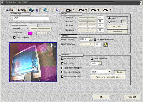 Сразу отметим следующее настройки всех видеоканалов абсолютно одинаковы, даже если их будет шестнадцать. Они абсолютно независимы друг от друга, и поэтому возможна уникальная настройка каждого канала. Что интересно можно задать автоматическую смену параметров видеосигнала (яркость, контрастность, и т.д.) с учетом времени суток, для чего и служит поле с двумя позициями "День-Ночь".