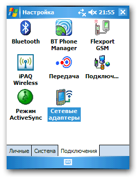 Теперь в настройках КПК следует выбрать вкладку "Соединения", а в ней "Сетевые адаптеры":