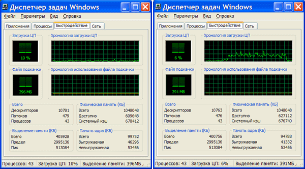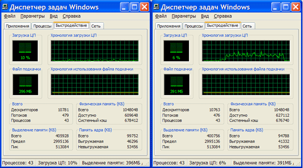 Эта плата видеозахвата обеспечивает одновременный захват 4 видеоканалов со скоростью до 10 к/с (определяется мощностью ЦП) на канал при максимальном разрешении не более 640 на 480 точек, чего вполне достаточно для решения большинства задач. Необходимо отметить, что данная плата не умеет аппаратно сжимать видеосигнал, поэтому вся работа по сжатию и детекции движения ложится на могучие плечи центрального процессора компьютера. В случае, если плечи все-таки окажутся не столь могучи, мы будем наблюдать "тормоза" в работе системы, и иметь пропуски кадров в архиве видеозаписей. Ниже приведена диаграмма загруженности центрального процессора в разных режимах работы при трех подключенных видеокамерах (слева запись, справа просмотр+запись):