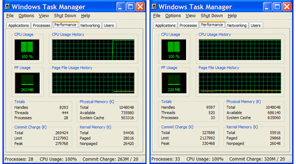 Вполне ожидаемые результаты. Сжатие 8-ми каналов видеосигнала силами центрального процессора это серьезно. Что и выливается в стопроцентную загрузку. При просмотре записанного видеоархива загрузка процессора, понятное дело, меньше не становится, лишь увеличивается объем выделенной памяти.