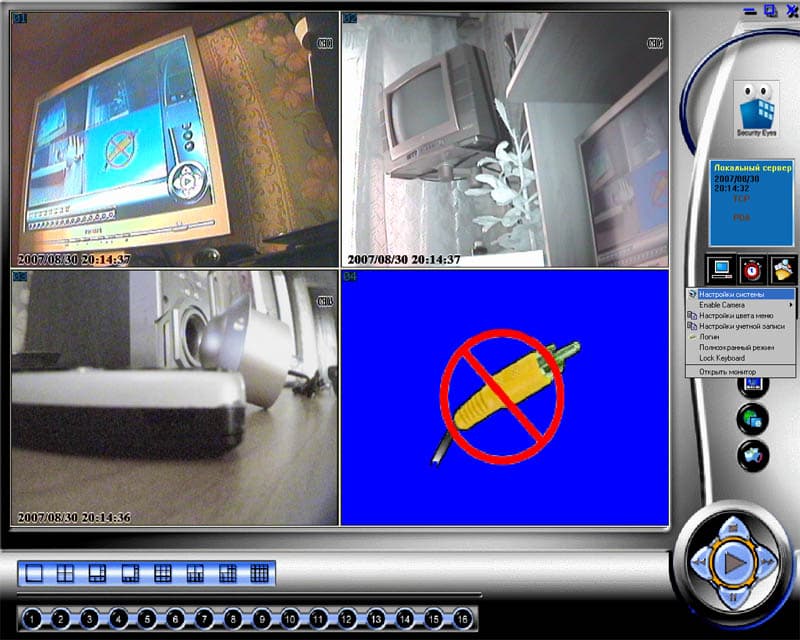 В нижней части этого окна видно, каким образом возможно разместить видеокамеры на экране (на языке профессионалов это звучит так: "формат мультиэкрана"). Также видно, что все управляющие функции находятся в правой части. Возле некоторых пунктов меню можно увидеть "кнопку-лампочку" таким своеобразным образом производитель хочет привлечь ваше внимание к важным деталям: при нажатии на нее появится подсказка или совет. Заглянем в "Настройки системы":