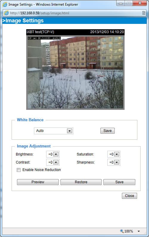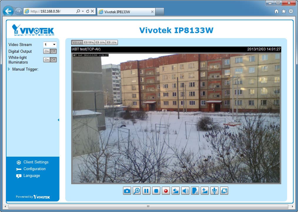 Камера, в зависимости от типа потока, умеет транслировать видео со следующими размерами кадра: 1280×800, 1280×720, 640×400, 320×200 и 176×144, частота при этом может составлять от 1 до 25 кадров в секунду. Что характерно, заявленная частота кадров полностью соответствует фактической — ни в окне браузера, ни в конечном видеофайле, записанном с камеры, нет и намека на пропуски кадров. Правда, при одном условии: хорошее освещение. Если света будет не хватать, камера увеличит выдержку с соответствующим результатом.