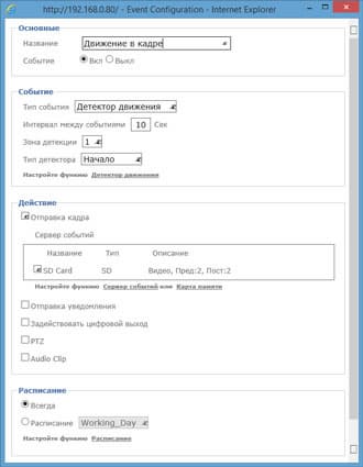 | Настройка событий. Здесь выбирается реакция камеры на срабатывание детектора движения | Настройка зон детекции движения. Точная подстройка чувствительности детектора и порога срабатывания |
