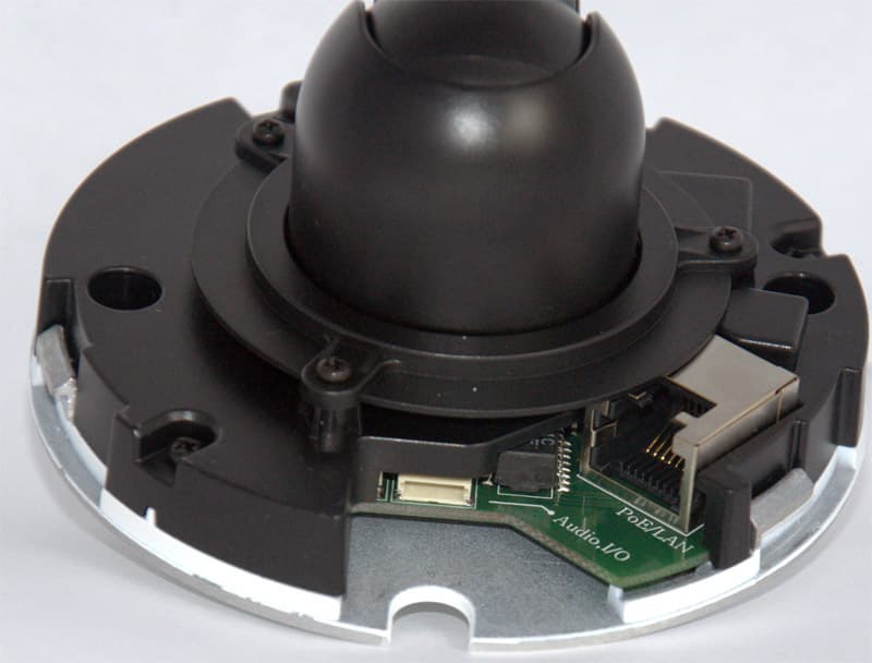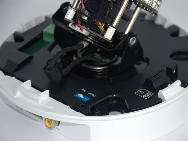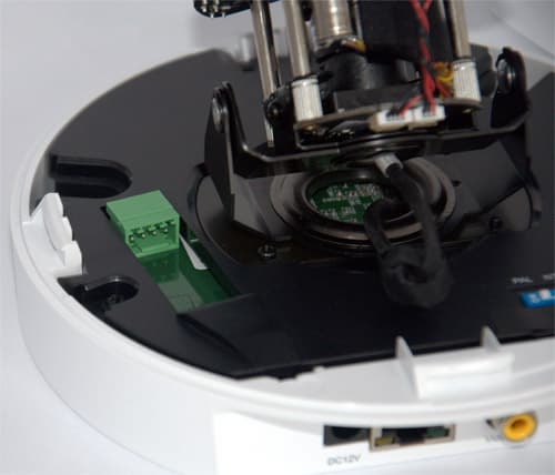 Здесь же мы можем снять и обычный (аналоговый низкочастотный) видеосигнал, для чего предусмотрен разъем типа «RCA». В отличие от предыдущей модели, производитель все же предусмотрел питание не только с помощью технологии PoE, но и от обычного блока питания, не обнаруженного, кстати говоря, в комплекте (но это объясняется довольно просто: возможность запитать камеру от блока — всего лишь опция; в то время как подобный тип устройств предполагается запитывать именно по PoE посредством любого подходящего источника питания, который придётся по вкусу интегратору, устанавливающему систему видеонаблюдения). Демонтировав декоративный купол, видим следующее: