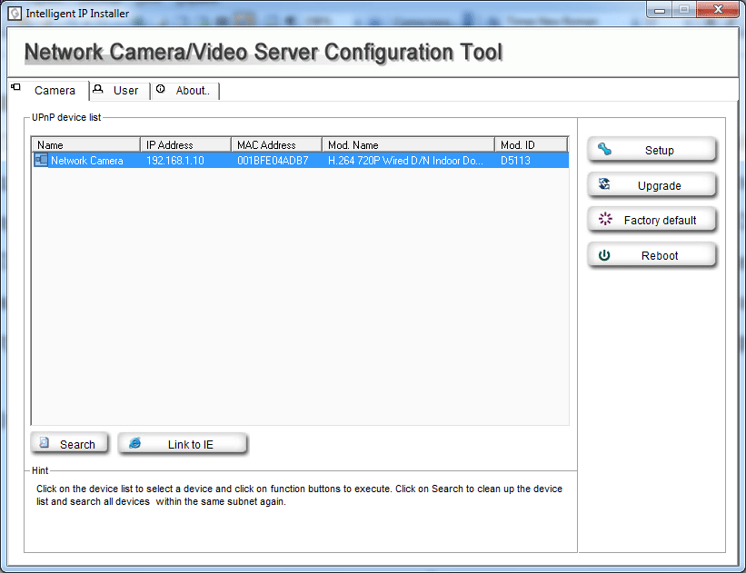 Обе тестируемых модели IP-камер построены на одной и тоже программной платформе, и для подключения к ним используются одинаковые средства и методы. Поэтому предлагаем начать процесс изучения программной части на примере Zavio D5113. Первым делом нужно как-то найти в своей сети IP-камеру. Для этого служит утилита под названием «Network Camera/Video Server Configuration Tool». Установка этой утилиты тривиальна, поэтому пропустим этот этап. После установки запустим эту программу: