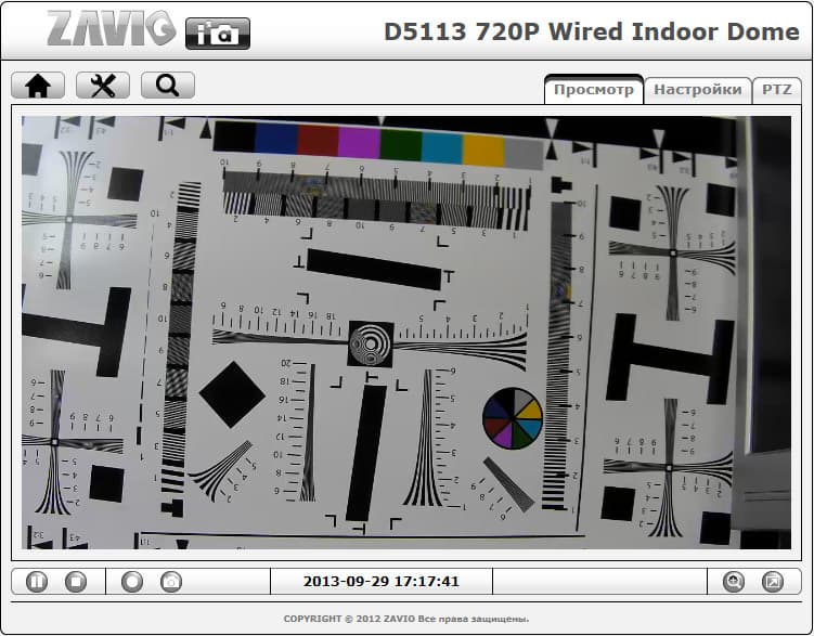 Как видно из таблицы выше, горизонтальное разрешение в центре кадра вполне соответствует заявленным 720 ТВЛ. Ближе к краю кадра разрешение падает, но применительно к камерам для систем видеонаблюдения данного ценового диапазона это явление вполне закономерно. Оптические искажения, практически незаметные в центре кадра, становятся ощутимыми по мере приближения к краю изображения — это неизбежная плата за широкий угол обзора. Цветопередача — на высоте: все цвета тестовой таблицы очень близки к оригинальным. Далее поместим на испытательный стенд Zavio D5113: