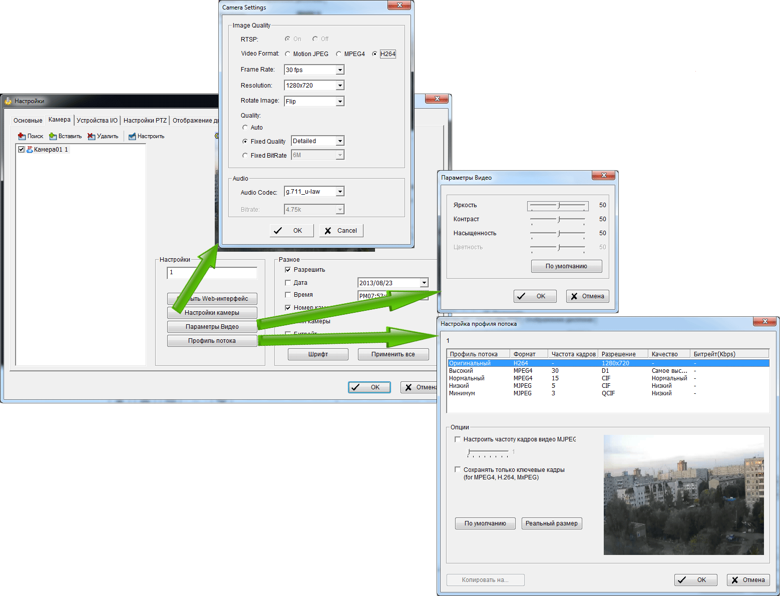 | Работа с изображением | положение кадра: отражение, переворот; видеомаска: время, дата, произвольный текст и изображение; настройки качества: яркость, контрастность, насыщенность, оттенок | |