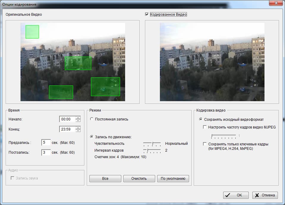 Очень удобно, что производитель предусмотрел наличие гибко настраиваемых режимов пред- и постзаписи видеопотока. Далее заглянем в настройки: