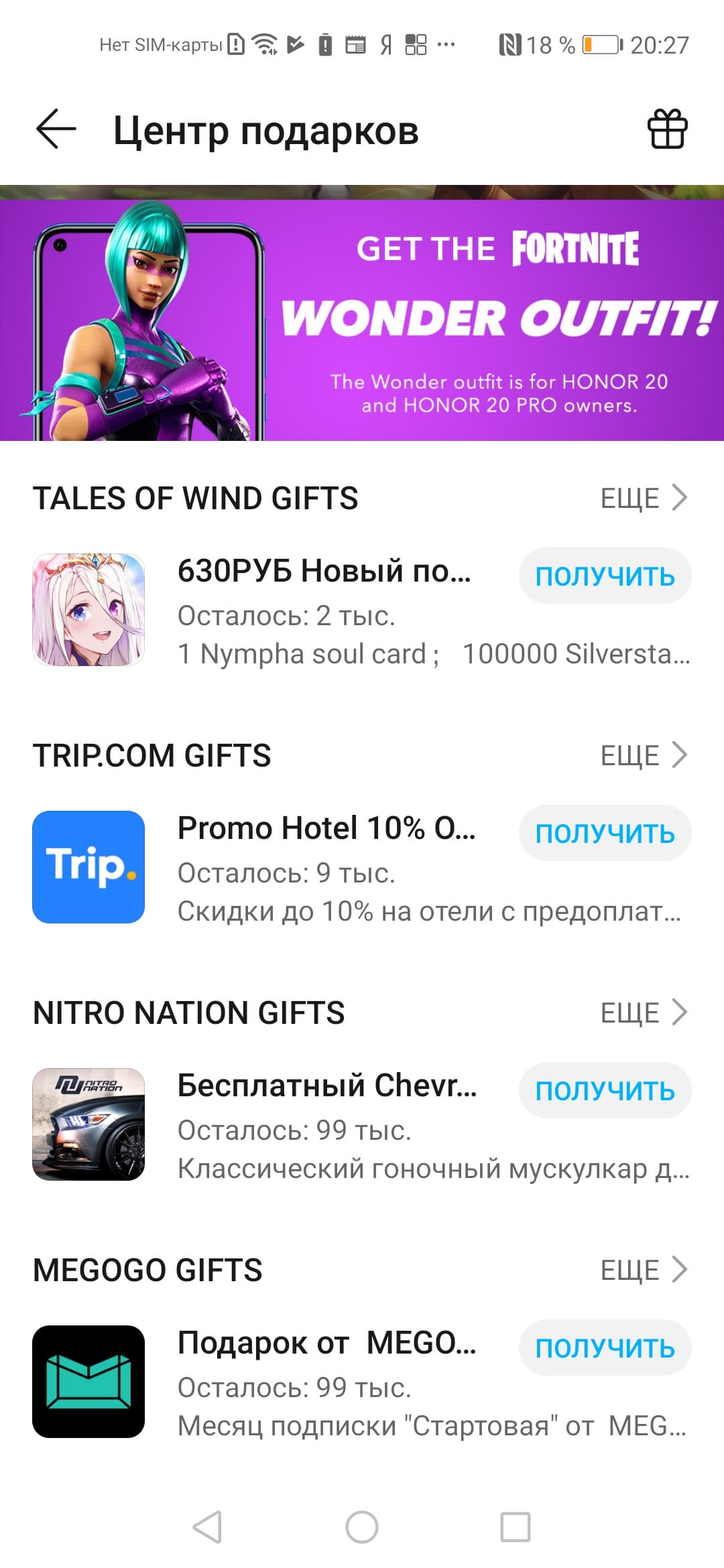 В смартфонах Honor есть отдельный магазин приложений — App Gallery. У этого сервиса есть сразу несколько интересных особенностей. Во-первых, подарки и акции для пользователей. Например, на данный момент (сентябрь 2019 года) вы можете активировать 10% скидку на бронирование отелей в trip.com, забрать бонусный пак для игры Tales of Wind, получить бесплатный автомобиль в Nitro Nation Drag & Drift и бесплатно пользоваться сервисом Megogo в течение месяца. Для владельцев Honor 20 и Honor 20 Pro также доступен специальный набор Wonder Outfit в игре Fortnite. Акции и подарки регулярно меняются, так что рекомендуем следить за обновлениями.