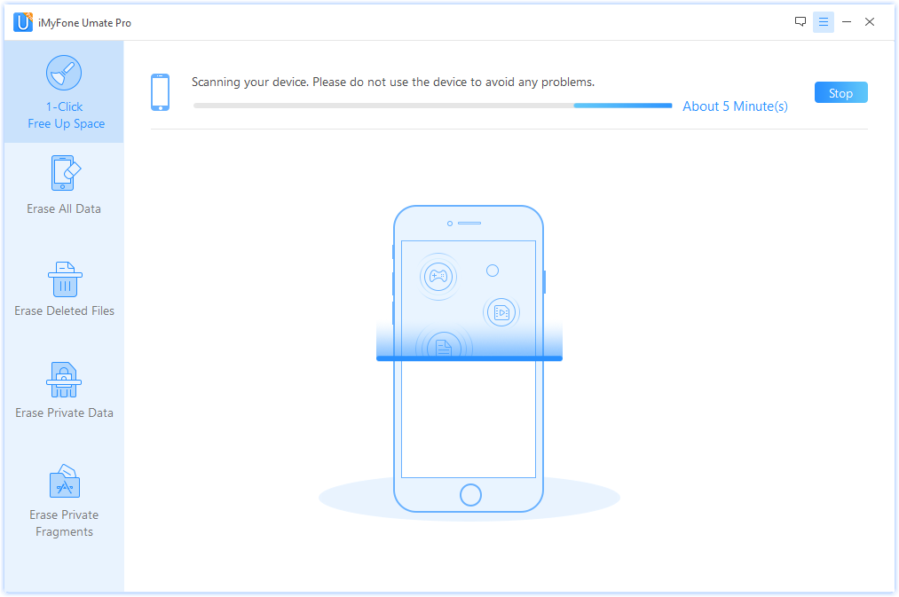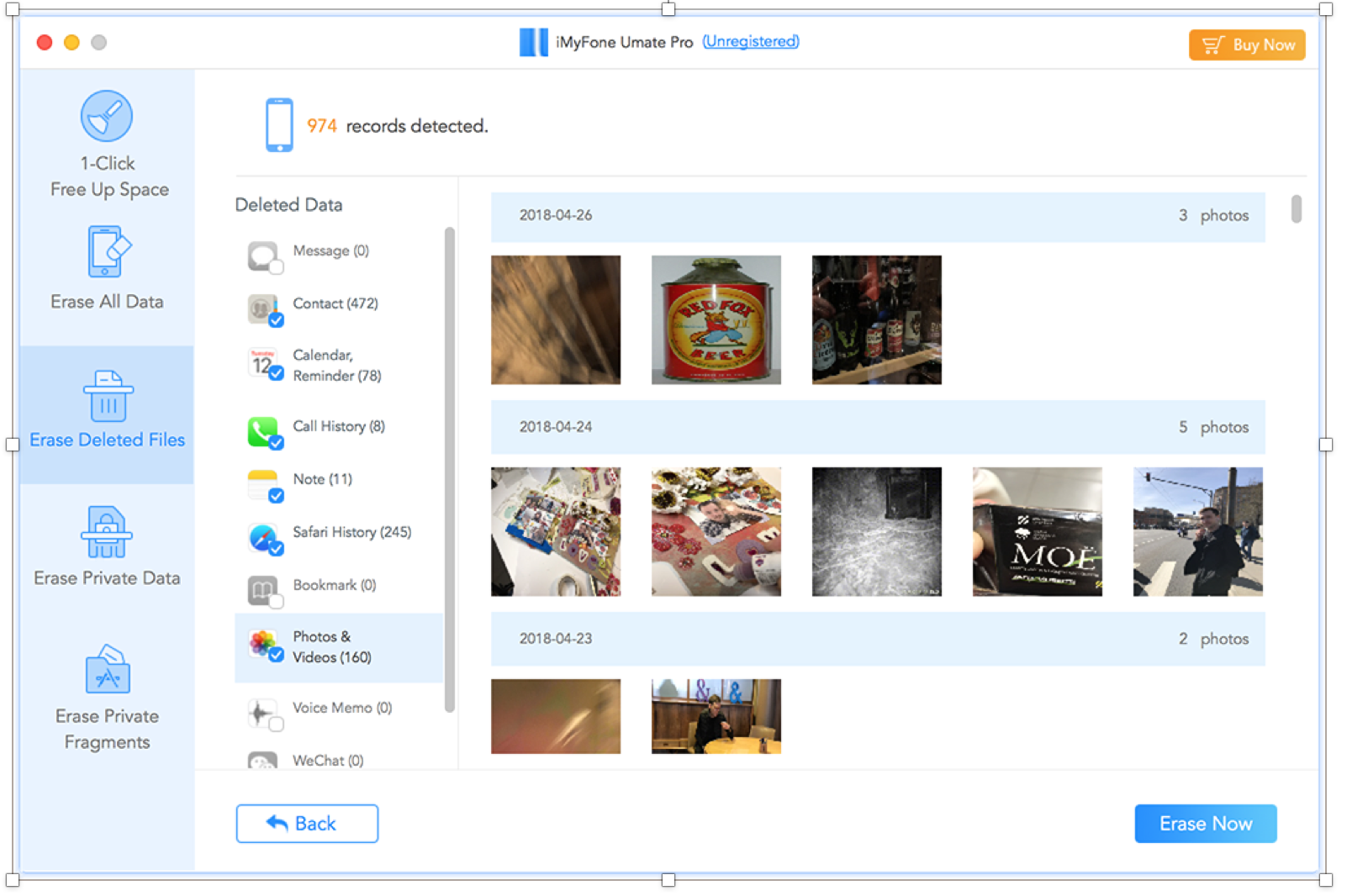 Erase Deleted Files, по идее, должен проверять устройство на предмет удаленных логически, но не физически данных. Umate Pro проверяет, какие фотографии, сообщения, заметки и звонки были помечены как ненужные и удаленные, а затем предлагает расстаться с ними навсегда.