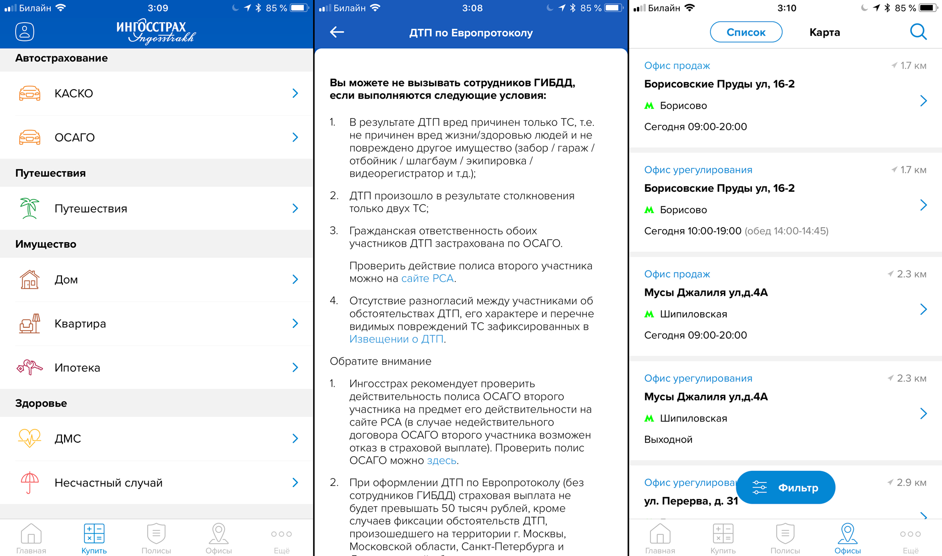«Ингосстрах» занимается не только добровольным страхованием автомобилей, в его арсенале любые виды страхования: ОСАГО, страхование жилья, полисы для путешествующих — всё можно оформить через приложение.