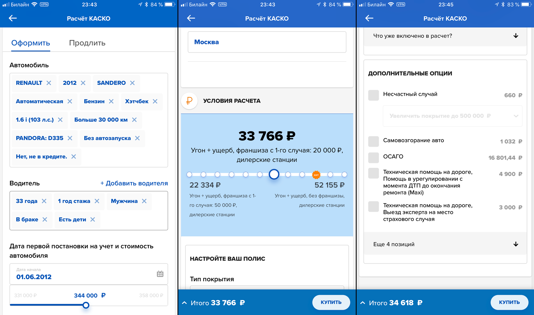 Затем можно переключаться на экран «Купить» и выбирать полис каско. Анкета достаточно простая, во всех пунктах приложение даёт варианты на выбор. Нужно указать марку и модель автомобиля, пробег, модель сигнализации, год выпуска, дату первой постановки на учёт (тут придётся подглядеть в ПТС) и информацию о водителе. Результат расчёта — линейка комбинаций страховых условий, по которой можно таскать ползунок. На ней сразу подписаны цены самого дешевого и самого дорого вариантов и их описание. А ниже можно добрать дополнительных опций, включая, например, техническую помощь на дороге.