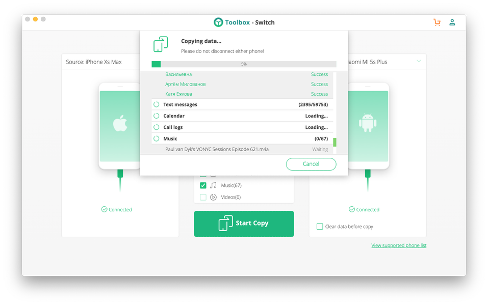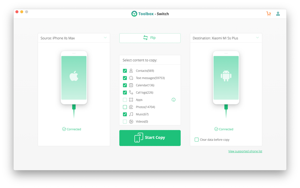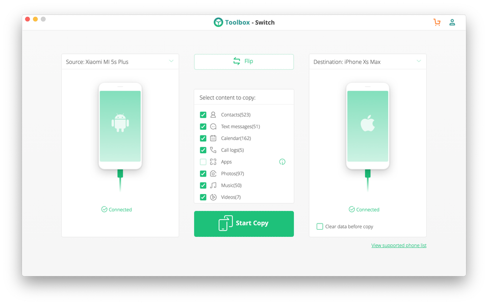 Switch (страница на сайте разработчика) заявлена как утилита для простого прямого переноса контента между смартфонами на одной или разных платформах. Поддерживаются устройства на Android и iOS. Разработчик не уточняет полный список совместимых версий систем: например, для iOS явно перечислена поддержка от iOS 9 до iOS 12, а также упомянуты более ранние системы. До каких пор ранние — загадка. Для Android упомянут Android 6.0, более современные и более ранние системы. На сайте iSkysoft есть список официально поддерживаемых телефонов, среди которых, например, упомянут даже самый первый iPhone, которому исполнилось уже 12 лет. Возможно, для таких старых устройств поддерживается не вся функциональность пакета iSkysoft Toolbox.