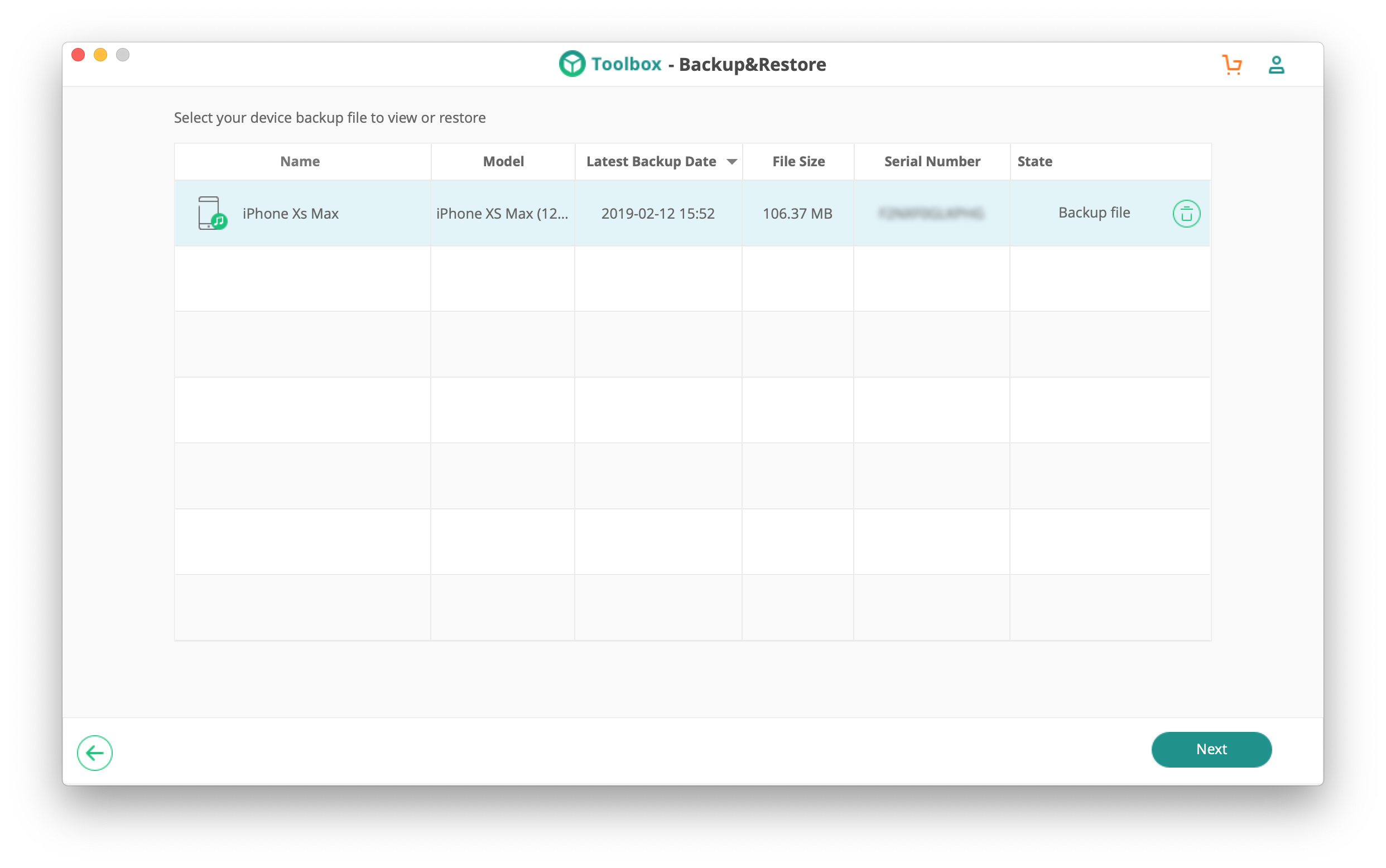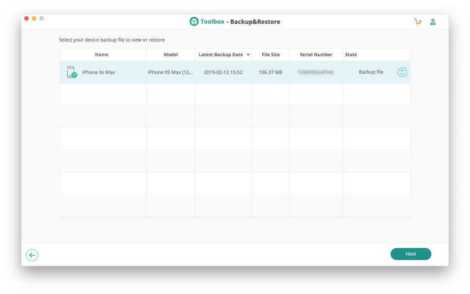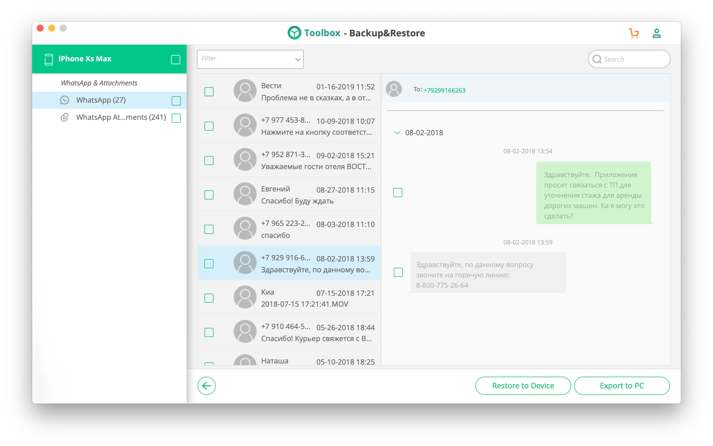 При восстановлении переписки из бэкапа iSkysoft Backup&Restore покажет список локальных копий с указанием типа устройства, даты создания архива и даже серийным номером смартфона, что может пригодиться сервисным центром, которые оперируют десятками и сотнями бэкапов.