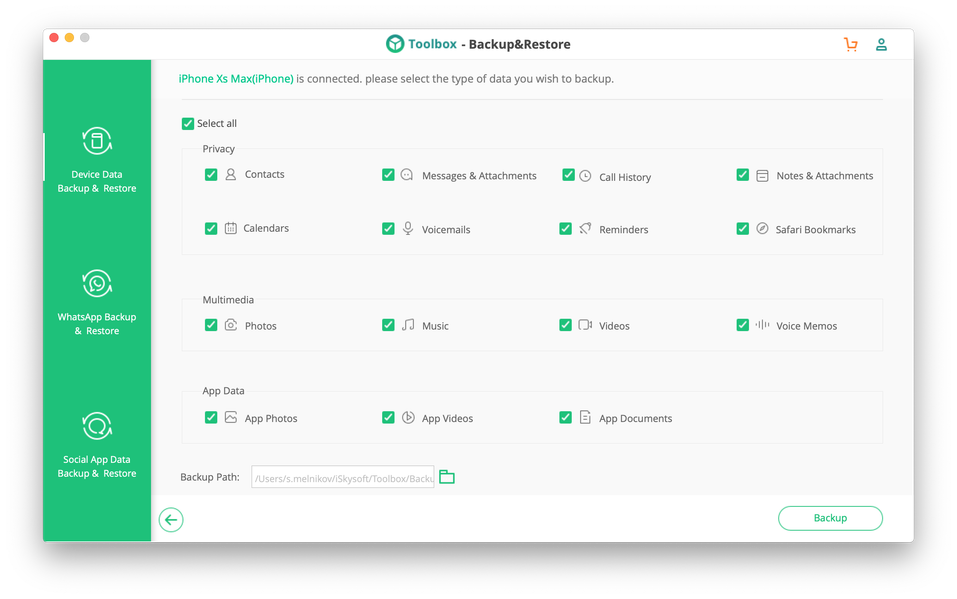 На первой вкладке можно сделать полный или выборочный бэкап контента с iOS-устройства. Просмотреть данные перед началом копирования нельзя, сразу по клику кнопки Next начинается очень долгий процесс.