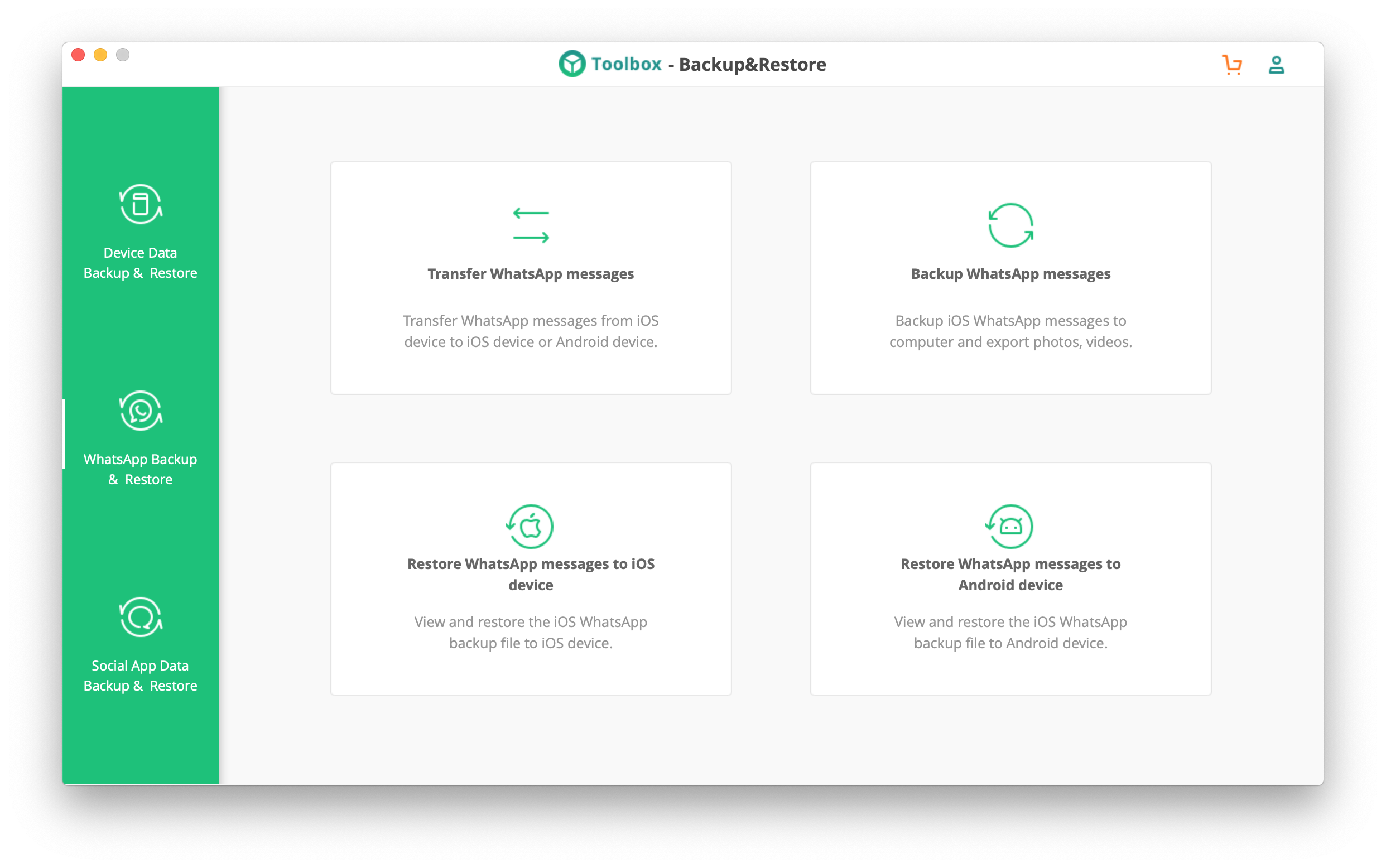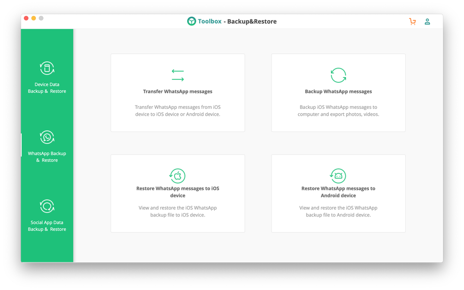 Вторая из трех вкладок утилиты посвящена мессенджеру WhatsApp. Четыре кнопки отвечают за перенос данных WhatsApp между iOS и Android, создание локального бэкапа, восстановление его на iOS и восстановление на Android.