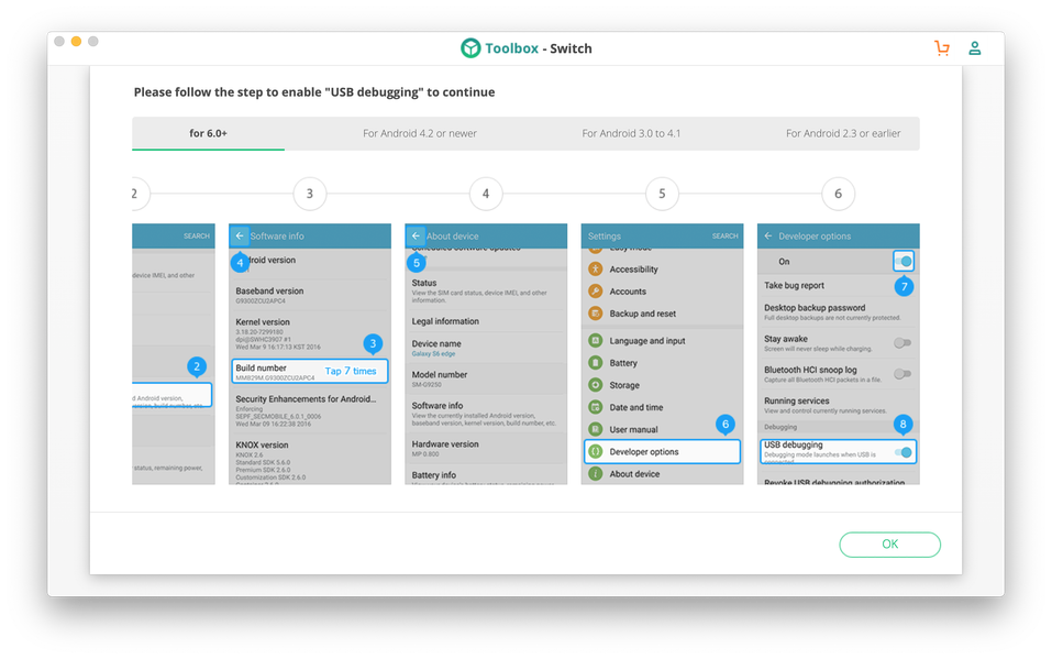Если для iPhone достаточно согласиться на подключение к новому (если речь о новом) компьютеру и закрыть iTunes, то на Android необходимо активировать режим разработчика и включить отладку по USB. При обнаружении Android-смартфона iSkysoft Toolkit демонстрирует инструкцию со скриншотами, как проделать все эти операции на разных версиях системы, вплоть до Android 2.3.